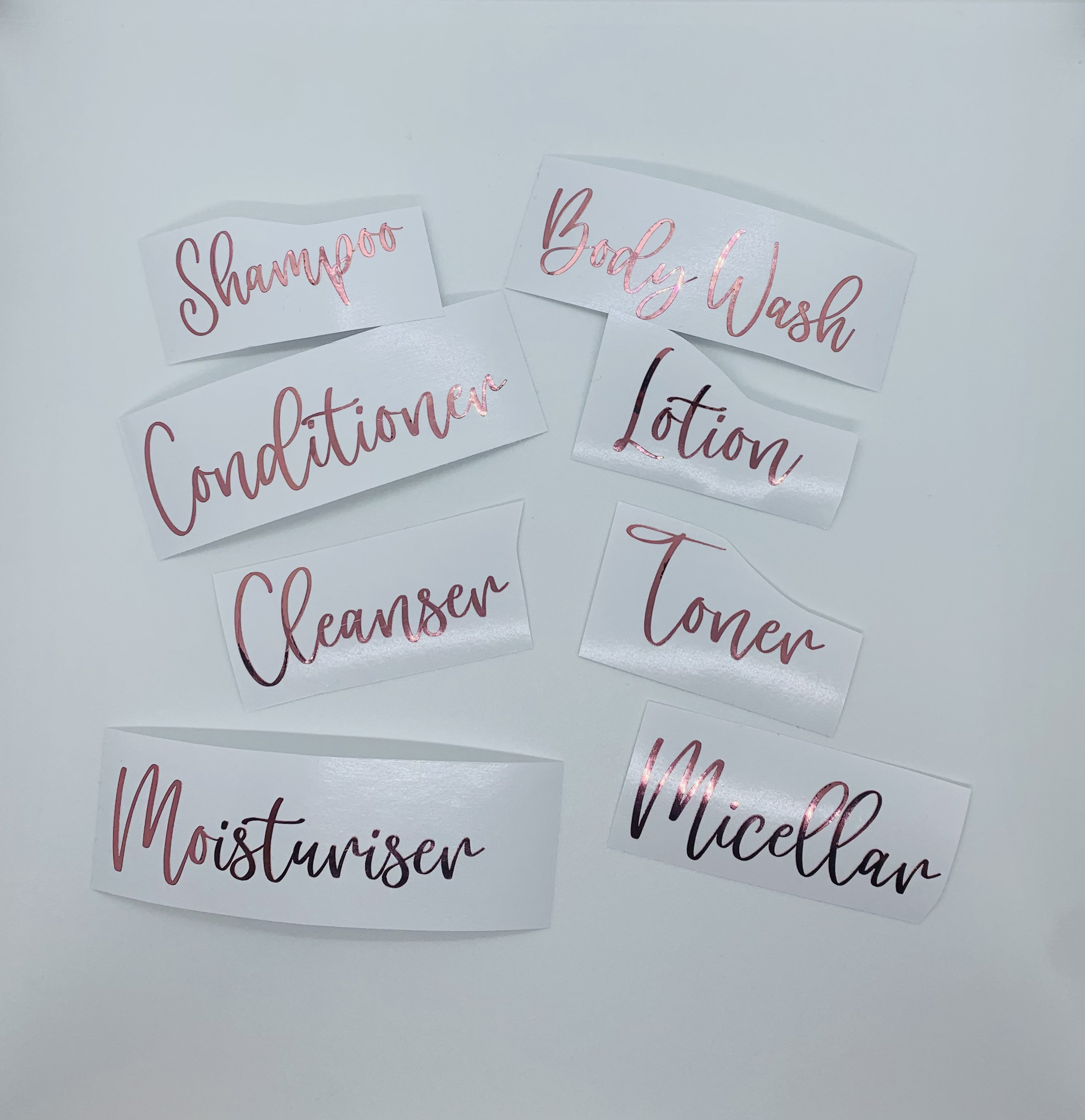 Travel Toiletries Labels - Bundle | LittleLabelHouse No need to ever get your travel toiletries mixed up again with this gorgeous set of four labels. Each set contains a shampoo, conditioner, shower gel and cleanser. Dye cut from premium vinyl, our waterproof labels come without backing giving you that 'painted on' look. The longest label comes in at approximately 8cm. For more details on this, please see the section on 'label sizes' below.